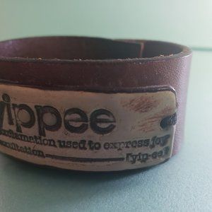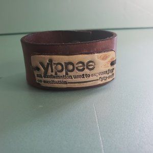 Leather cuff bracelet with ceramic piece reading "yippee ...