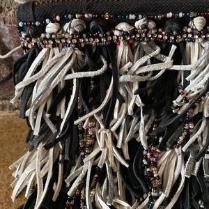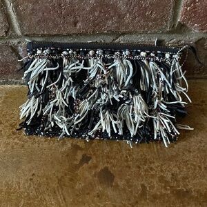 Like new Leather fringe beaded bohemian zipper top clutch bag. Approximately 9”x6”x1”, see pictures for details.