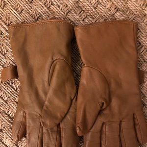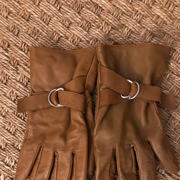 These gloves are a size small (runs big), very soft, lined,camel color with an adjustable tab that runs through a metal ring. Very comfortable.