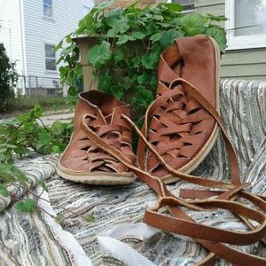 These high-tie leather sandals are gently used and in good condition. Long leather lacing ties up past the ankle. Cool and hip!