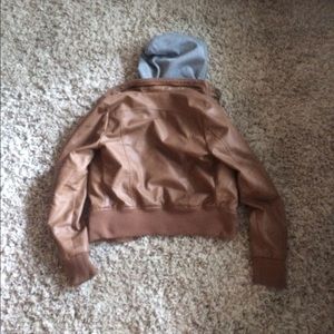 Light brown leather jacket, fuzzy on the inside for extra warmth! And hooded !