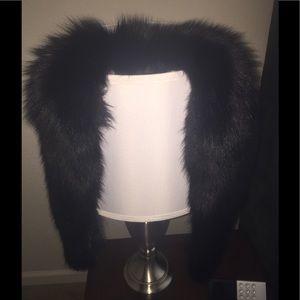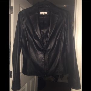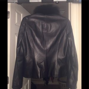 Black leather jacket with removable fur wrap around neck piece, 100% leather gently used.