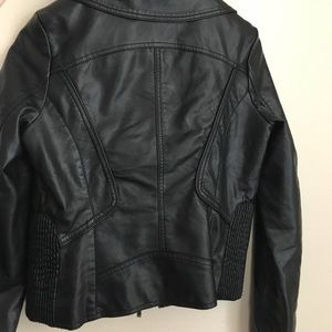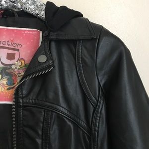 Perfect street style, faux leather jacket with detachable hood. Excellent condition, two functional front pockets.