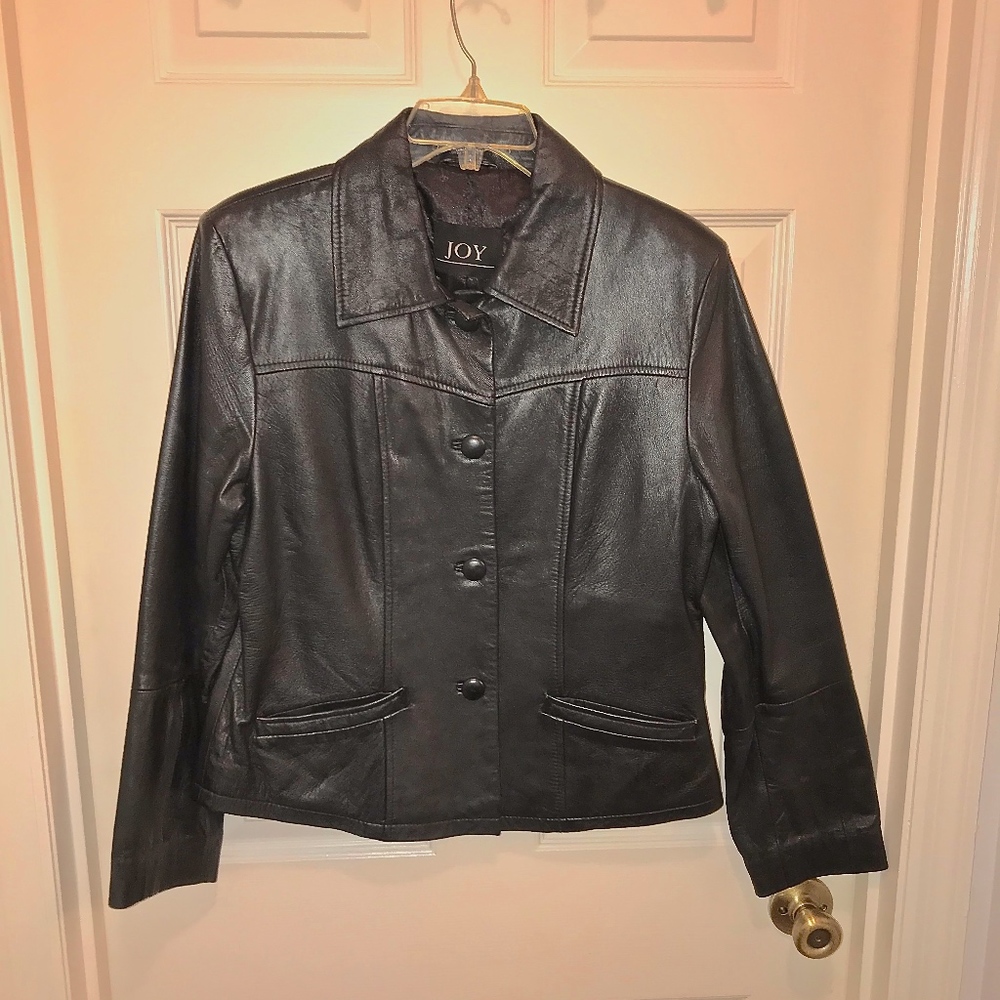 Joy black leather waist length jacket. Size 38 Euro., US 10-12. Four button front with collar. Two front pockets, one inside pocket. Sleeve length is 23 inches, cuffed under is 21 inches. No side or back slits.