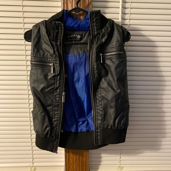 Tank top leather jacket with blue plaid hoodie