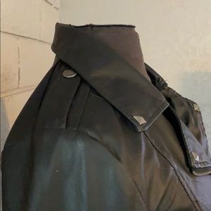 Cropped faux leather jacket with two pockets that zip up. Lapel accents and lower cross accents, zip to the top or half way and wear with a collar.