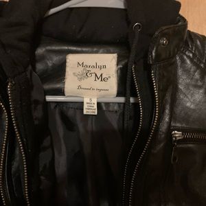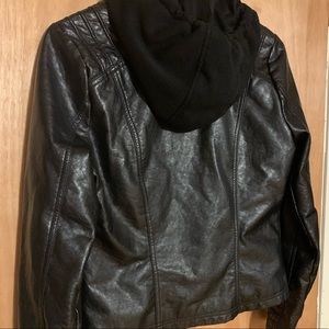 Cute black leather jacket with hoodie. This is a halter type jacket. In good condition.