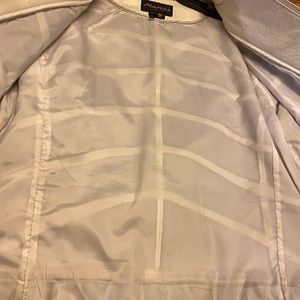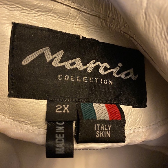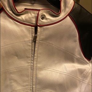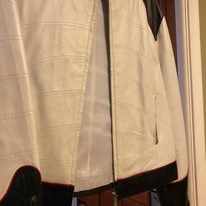 White leather jacket trimmed in red and black with a motorcycle look. Thick good quality leather fit true to size.