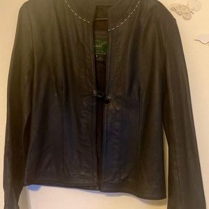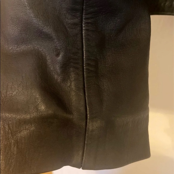 Dark blue, sheep leather jacket. White stitching collar and one button in the middle. Authentic, sheep leather.