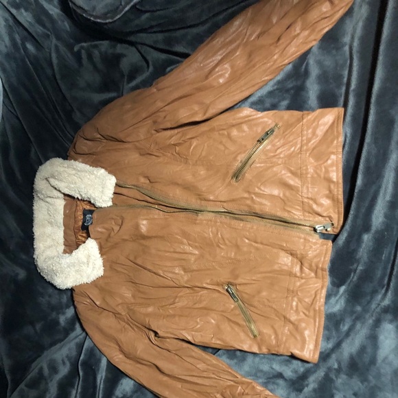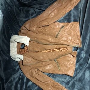 Beige/tan leather jacket with faux fur collar and trendy zipper. Purchased in Spain