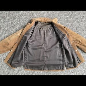 Very soft leather. Hangs nicely on the body. Not sure of the age, but likely vintage. It has been worn but no rips, tears, or stains. Fully lined. Extremely clean. Made in England.