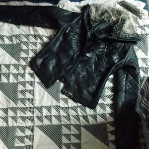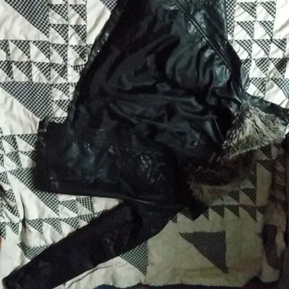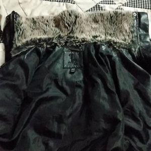 Woman's extra small leather jacket, black, fur trimming around neck, button up.
