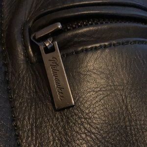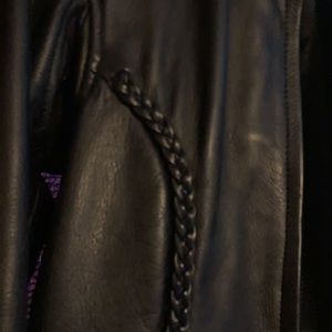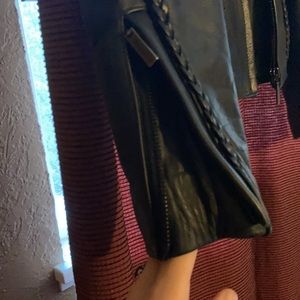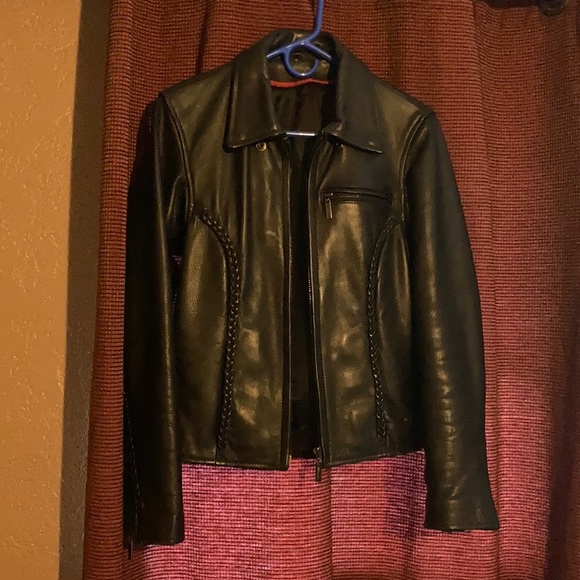 Quality leather. No inner lining. Braided detail on front and back. Zipper detailing on sleeves. Two inner pockets, one zips close. Outer pocket with zipper.
