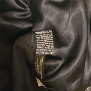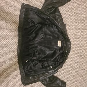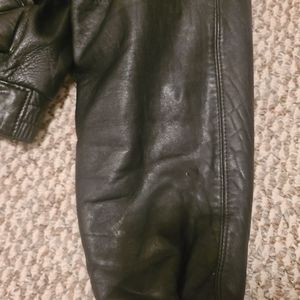 genuine leather motorcycle jacket, women's size small, zipper closure, zippered pockets on sleeves, snap closures at wrist, elastic waist in back, small tear and scuff on sleeve and back