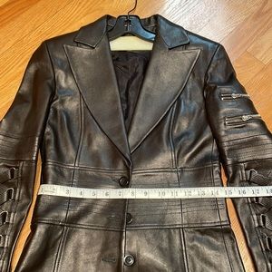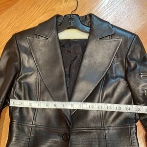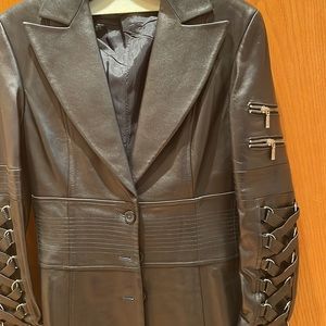 Form fitting with three buttons. Seamed front and back. Fully lined. Designer jacket. Soft leather. Like new. Tunic length.