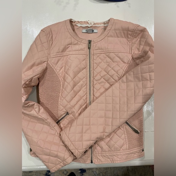 Forever 21 light pink leather jacket. Pulling around the inside back neck area, can not be seen when wearing the jacket.