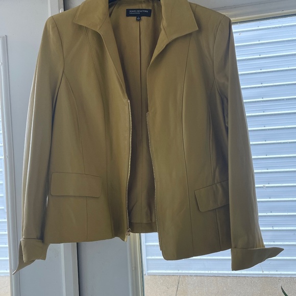 Jones New York leather jacket. Size Large. Mustard yellow in color. Excellent condition. Never worn. Tags in pocket where it was bought from TJ Maxx.