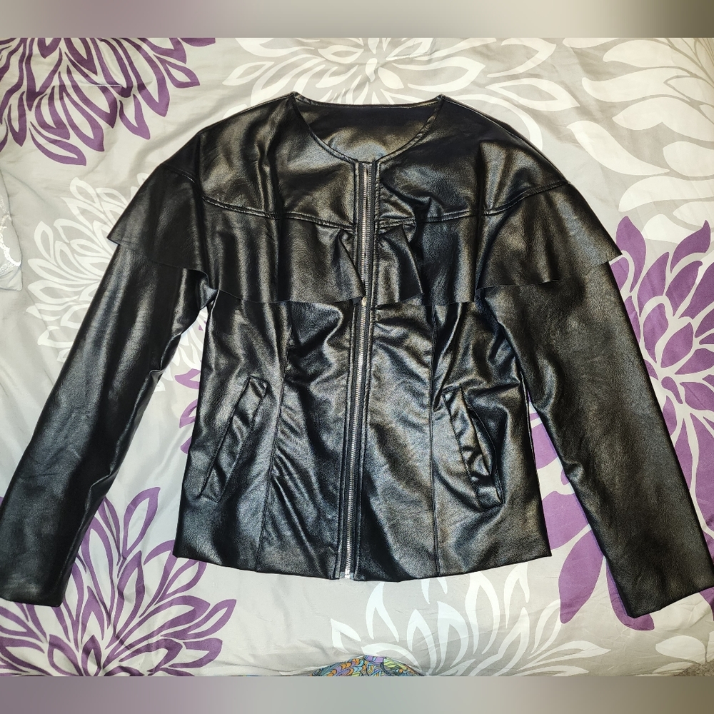 Stylish faux leather jacket. Ruffle detail. Brand new, never worn.