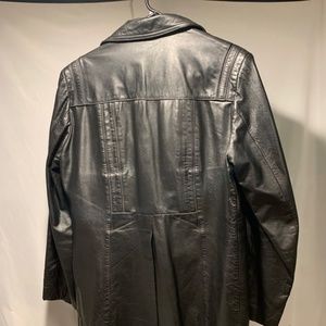 Size 36, Shoulder to shoulder~18”, hem to bottom~18”, hem to hem~21” Look stylish and trendy with this vintage pre-owned leather jacket from The Leather Warehouse. It features a zip-up and button-up design, making it perfect for any occasion. The jacket comes in a classic black color and a straight cut look, making it a versatile addition to any wardrobe. Crafted from high-quality leather material, this jacket is durable and long-lasting. It is an excellent choice for any fashion-conscious individual who wants to make a statement while staying comfortable and warm. Buy this unique piece today and add a touch of vintage elegance to your wardrobe. WILLING TO BARGAIN