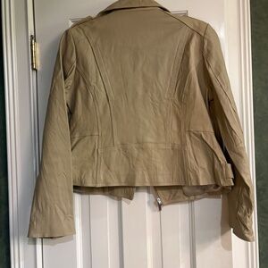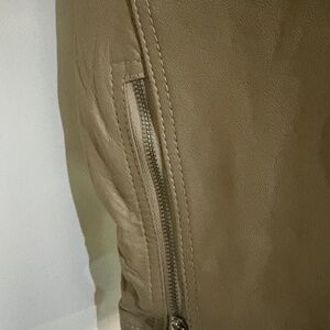 MODE GENUINE LEATHER JACKET, stylish can be dressed up, wear with jeans. EXCELLENT condition. Mid wait length. I would say this is a deep cream color
