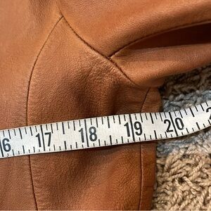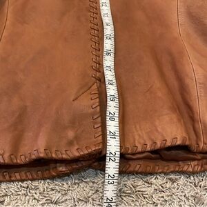 Wonderfully “distressed by design” buttery soft and supple leather jacket. Stylish whip stitching, real brass buttons, two front functional pockets, super clean silky polyester lining. Functional for warmth but not too heavy, I would say a light to medium weight jacket to wear with Levi’s or a floral midi skirt or dress and boots.