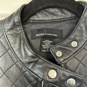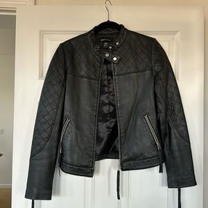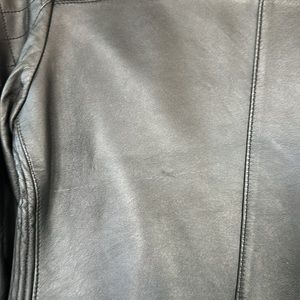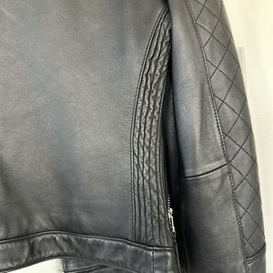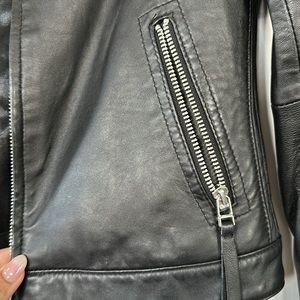 Black leather moto jacket - beautiful and great condition. Shows slight wear on the back see in picture. Classic piece to add to any closet. Size small.