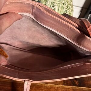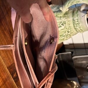 About 12 inches wide and over 8 inches tall. Vintage. Normal wear. Zip compartment and snap compartment