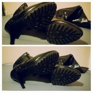Black leather, over the knee, zipper inside, 3 inch heel, grippers on bottom, slit in back opening