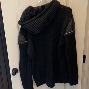 Black knitted sweater with leather sleeve patches. No smoke or pet smell or damage. 3xl runs small. Sharp sweater worn once!