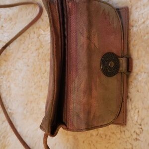 Light weight small purse. 7 1/2 by 5 1/2 in size. Several compartments and a small mirror. Good condition. does have a design. Long strap. Minnetonka genuine leather.