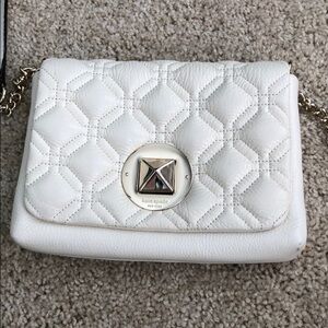 Beige/cream colored leather Crossbody in quilted leather by Kate spade. Gold detailing with gold chain and leather Crossbody strap. Red fabric inside. Excellent condition. Only used a couple of times. Smoke-free home.