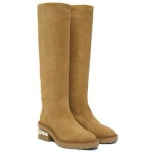 Calf-high paneled suede boots in tan. Signature faux-pearls at block heel.