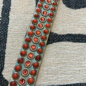 Distressed turquoise leather belt with silver coral and white details. Stone and rhinestone…Snap removable buckle