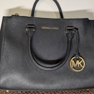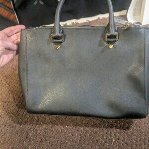 Gorgeous black leather satchel acts like a purse or small "briefcase" Gold detail logo, zippers and tags. Sturdy high quality construction. Inside pockets and key latch. Removable longer strap. Like new, barely used. Have tags. 13" length 9" height.