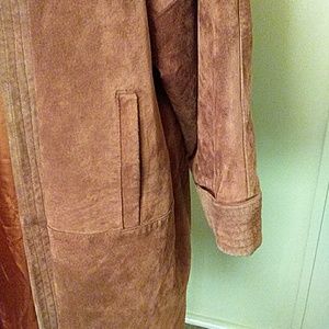 Brown suede lined with cuffed sleeves and slit pockets. Open front, no snap or button. Slight discoloration on the inside lining (see pic). Some wear on cuffs (see pic)