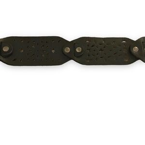 This cool belt is in excellent pre-owned condition. The belt is made of leather and has panels joined together with silver rivets. Each panel has different cut out pattern in it. It also has a silver buckle. It’s approximately 37” long and 1 1/2” wide.