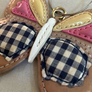 Cute leather butterfly keychain. I googled it and it looks like it is a Guess brand, but it is not marked. Approximately 6 inches long with cable attachment..