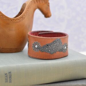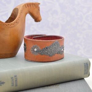 This bracelet is crafted from an up-cycled, hand-cut brown leather belt. On it, I've riveted an embossed gunmetal wing and aged brass filigree flowers.