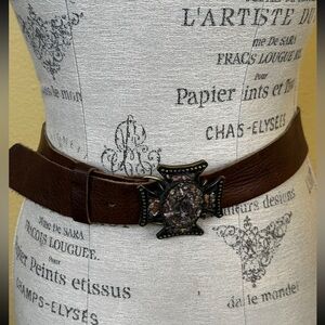 LeatherRock Vintage Brown Leather Belt with Ornate Stone Gothic Cross Buckle 34