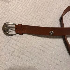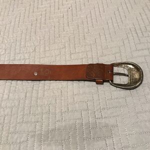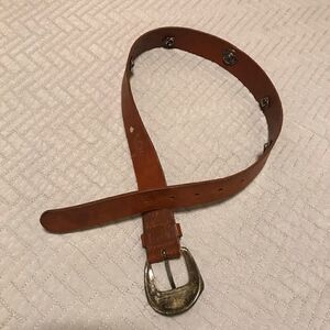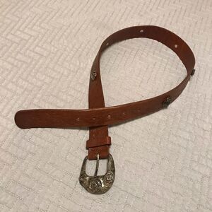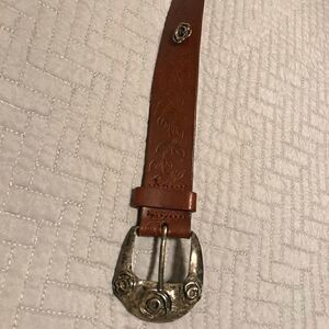 Whiskey leather Tack Belt. Embossed leather design with silver buckle and 6 silver flower conchs. 5 eye 33” without buckle. Brand is worn, only visible marks are a number 16, and can just make out genuine leather. 1 1/4” width. Two small spots on beltloop- see photo. So pretty #tackbelt #western #powerofabelt
