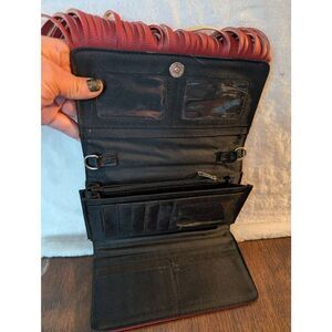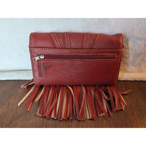 Maroon and cream colored Leather and turquoise western fringe details, wallet. Small black mark on leather in the back. In otherwise excellent condition.