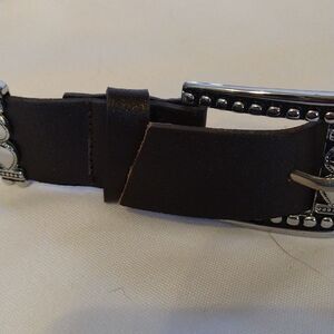 leather and metal belt, the metal pieces are individual and free moving, this belt is heavy. looks like the end of the belt has been cut but still useable. 36"