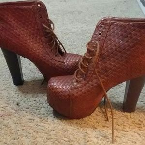 Woven lace up booties that has been lightly worn (1 time). Like new. I was getting started in wearing heels and ordered the wrong size. There is a slight white scuff mark at the back of the right heel. Soles relatively clean but can provide more pictures.