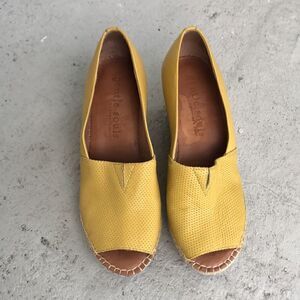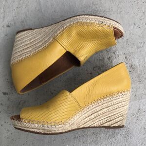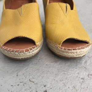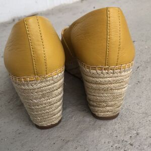 Super cute wedge, espadrille style. Check out the pictures they are in great condition. Heel height is 3 inches and the platform is half an inch. Not yellow, but yellow. More like a mustard yellow.