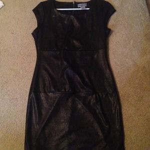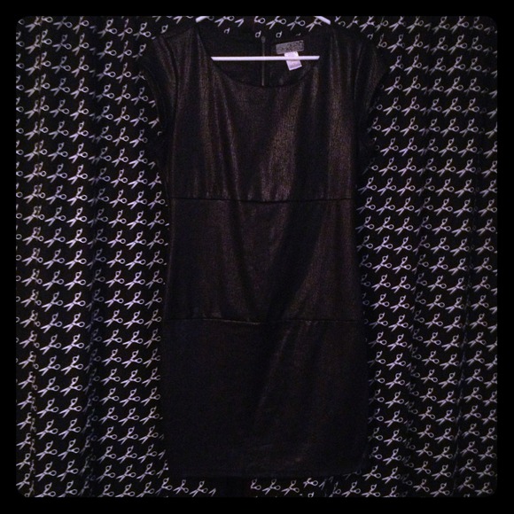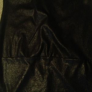 Unique fabric that looks like leather but is soft and shiny. Dress shape is simple easy to accessorize but stands out enough in its own. Bad. Ass.