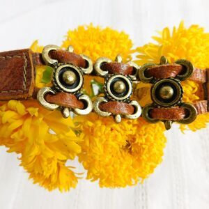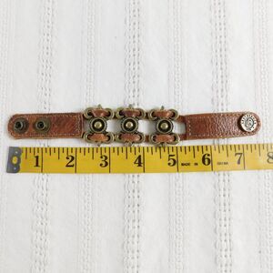 Leatherock USA, Genuine Leather and Brass Cuff Bracelet. Measures 7.5" Length, with 2 snaps for adjustable fit. Width 3/4" to 1 1/4". Soft flexible leather.