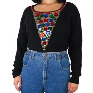 L'eau Vive 1980s Vintage Black Sweater with Rainbow Chunky Rhinestones Medium