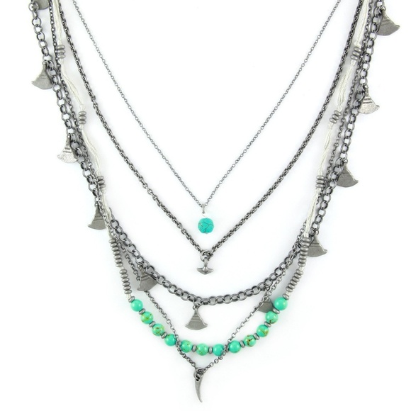 Make a statement! This layered antiqued silver necklace features various pendants and turquoise accents.