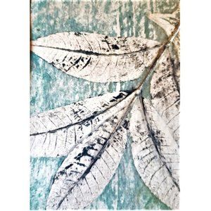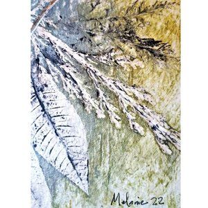 Leaves I Monoprint, 1 in a Series of 2. Signed by the artist (me!). A riff on traditional Japanese Gyotaku printing, leaves of ash, juniper & mulhy grass are printed in black against a soothing background of cool, pale shades of slate/powder blue and avocado/grass stain green (the exact color of the stains on your pants when you were a kid). This print was made using a roughly carved/textured wood block overlaid with found leaves from the edge of the desert, then hand inked and rolled thru an etching press on heavy (140 lb.) watercolor paper and finally, strategically hand-rubbed. This process produces an embossed surface with good relief and color texture. Print comes with bevel-cut black matte and white backer board in a clear plastic protective sleeve. Image is 6.5" x 4.5"; matte is 8" x 10". Ready and waiting to be framed to compliment your personal style - pairs perfectly (by design and with intent) with the Leaves II Monoprint, also here in my closet. Elevate your home, or that of someone you love, with affordable & original art!