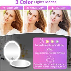 3 Color Light & Brightness Adjustable - Electric illuminated mirror provides warm/natural/cool light to meet the makeup needs of date/outside/office. Tap the sensor to turn ON/OFF the lighting, long press 3s to adjust the brightness. The light will automatically turn on or off as the mirror opens and closes